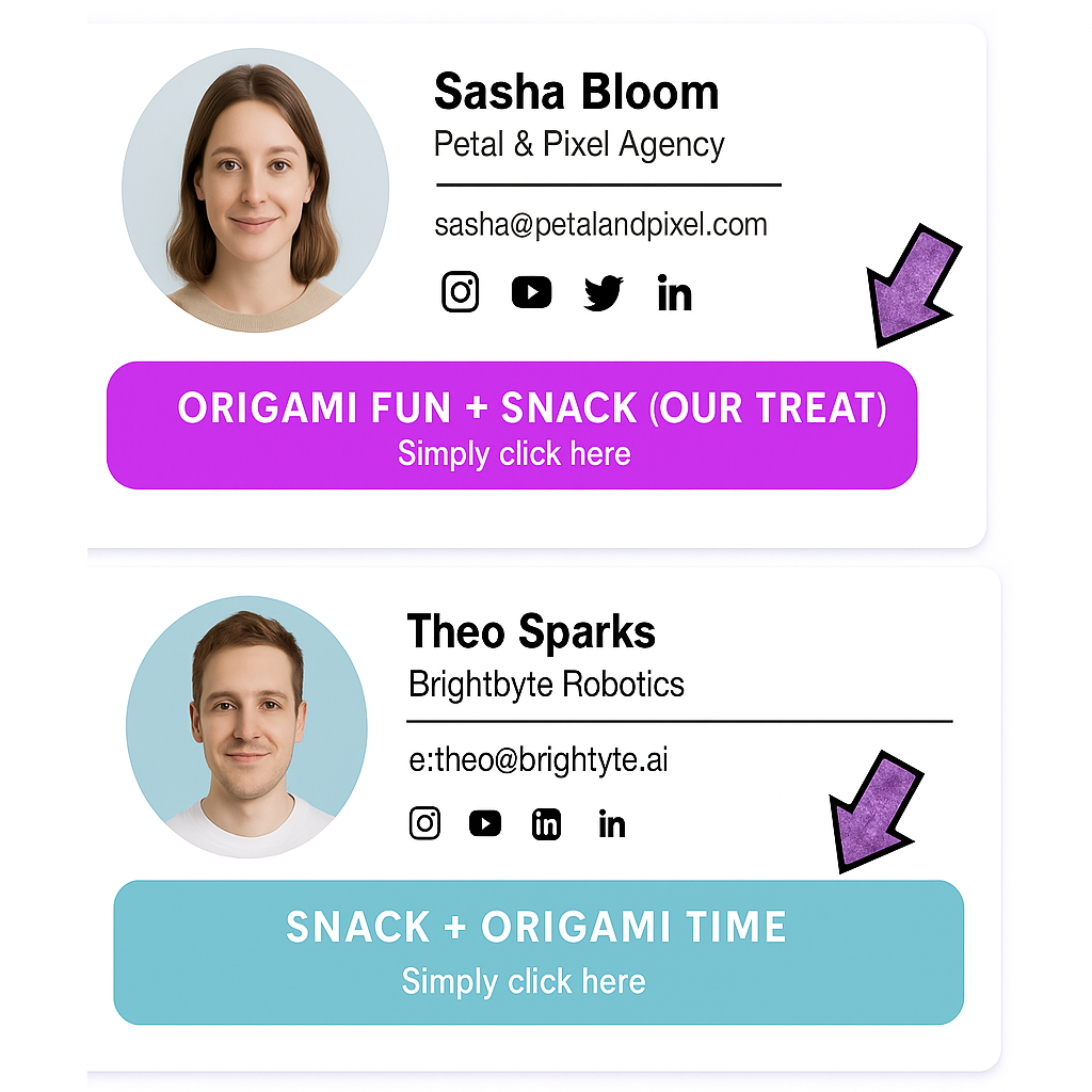 Connect Rockkt to your email signature and let Freestyle do the magic — turning every email into a real conversation starter. Automatically offer a thoughtful snack + origami gift set with your signature, creating surprise, delight, and memorable first impressions without lifting a finger... all powered by your prewritten templates.